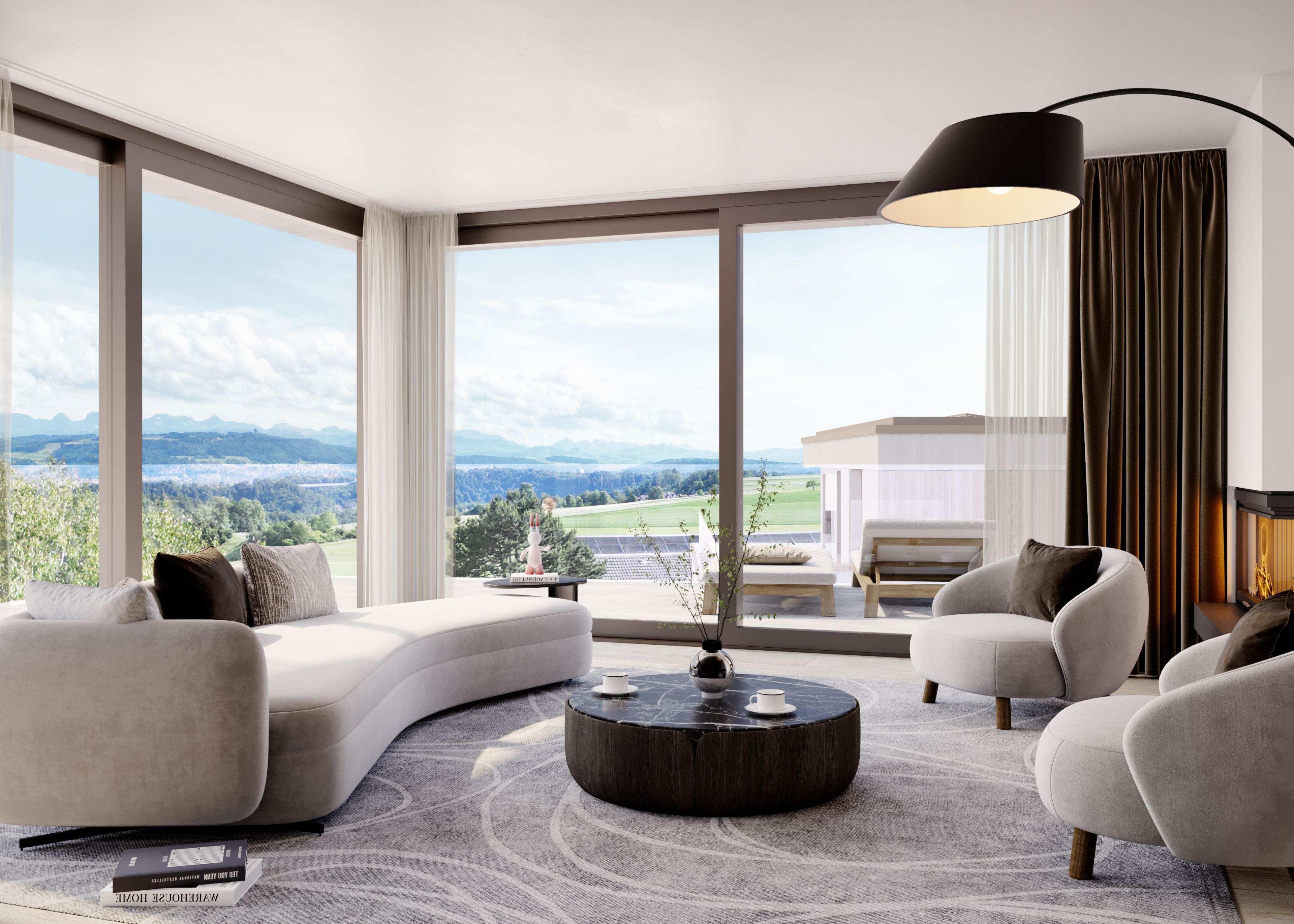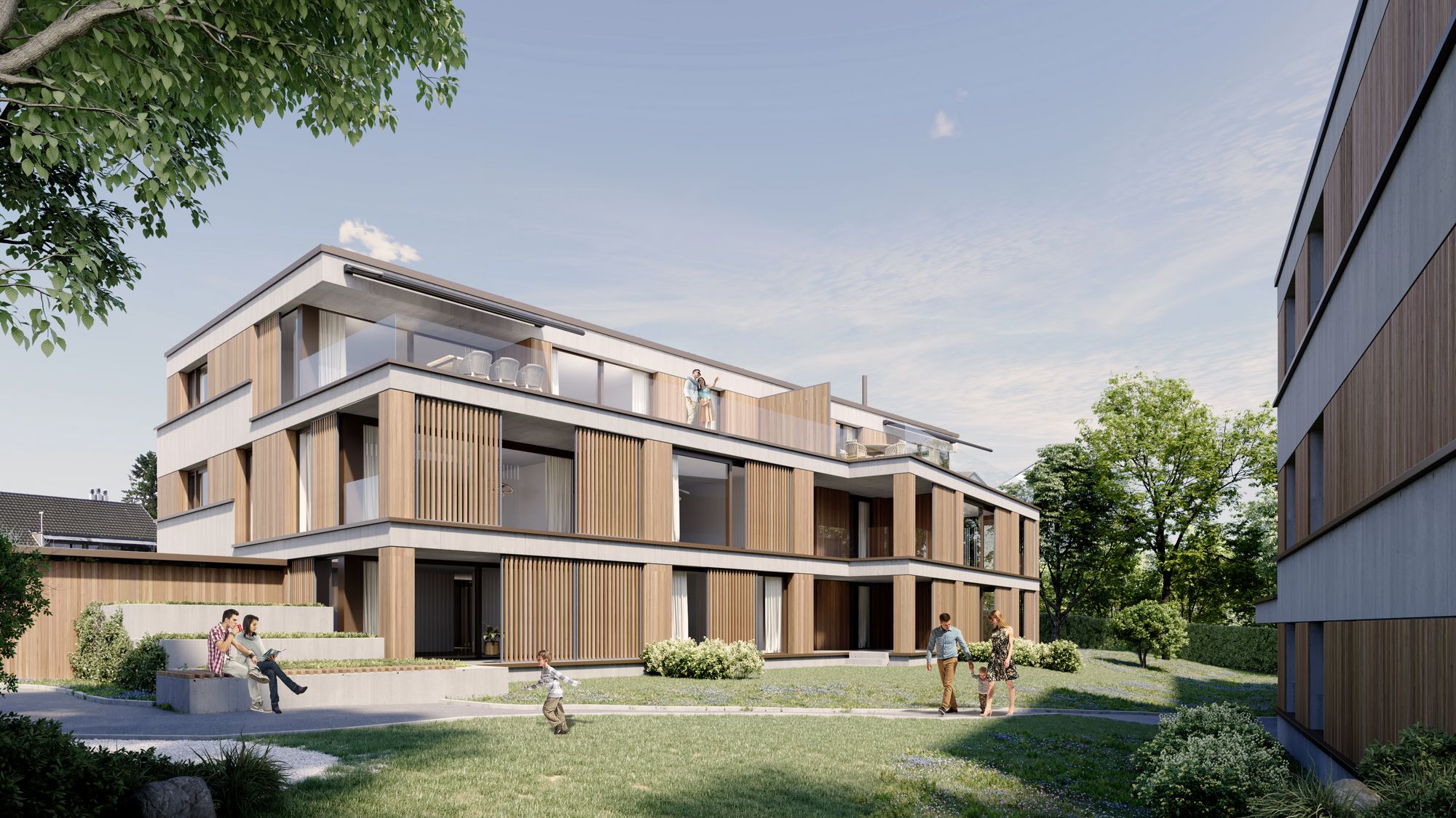 Die Fassade ist mit einer Holzschalung und Faserzementelementen verkleidet. Zusammen mit der hinterlüfteten Unterkonstruktion bildet dies ein langlebiges und zugleich elegantes System. Weiter zeichnet sich die Fassade mit grosszügigen Fenstern aus, welche die Räume mit Licht durchfluten. Die Aussenräume definieren sich durch privaten Garten, wohnlichen Loggien und grossflächiger Terrasse im Attika.